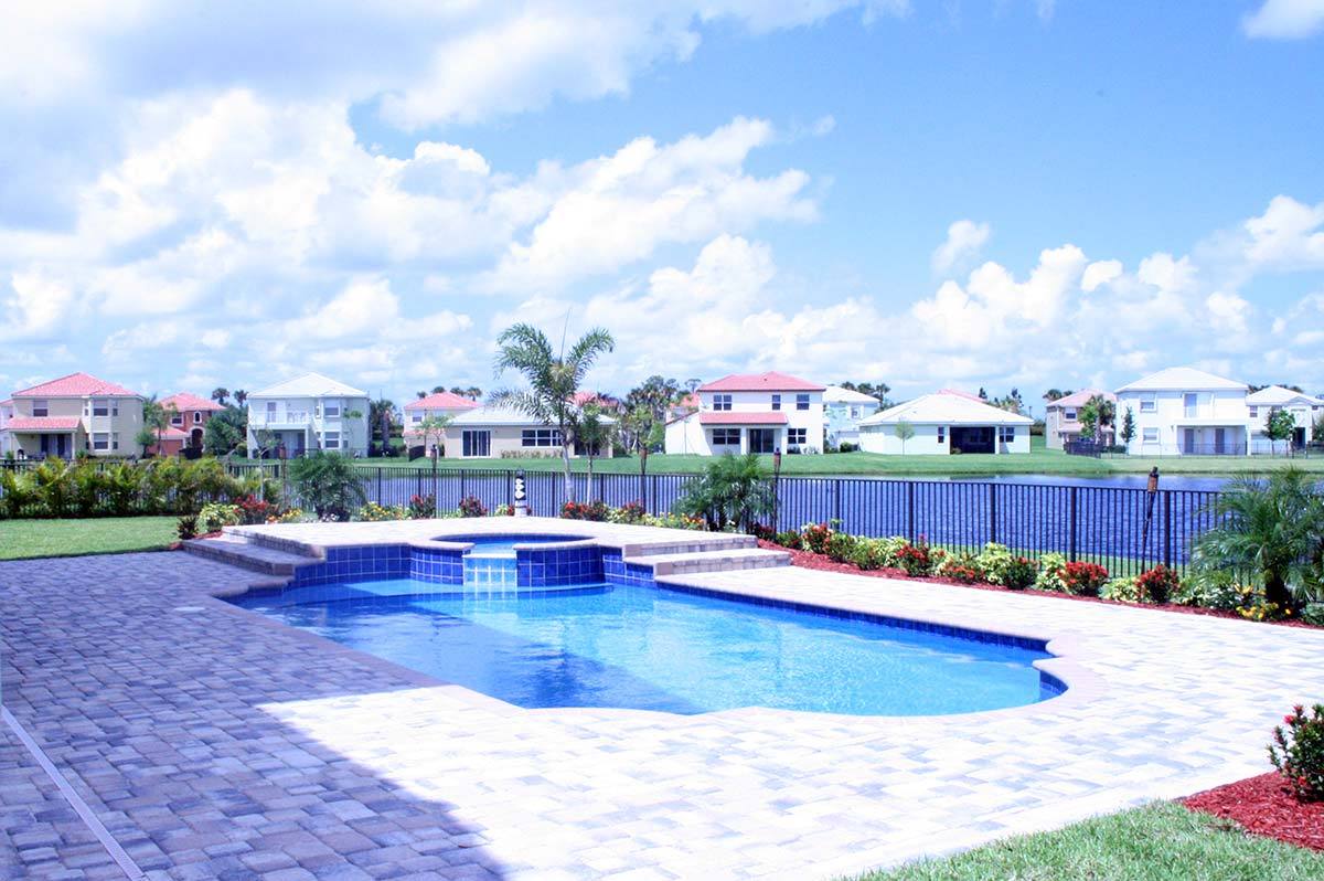 backyard swimming pool with interlocking brick paver deck