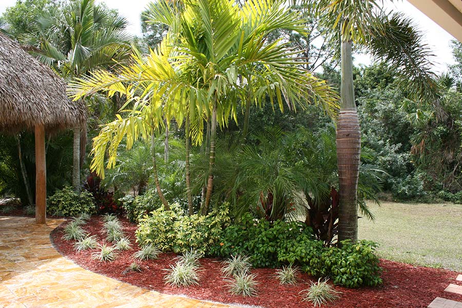 landscaped backyard with paver patio and Tiki hut
